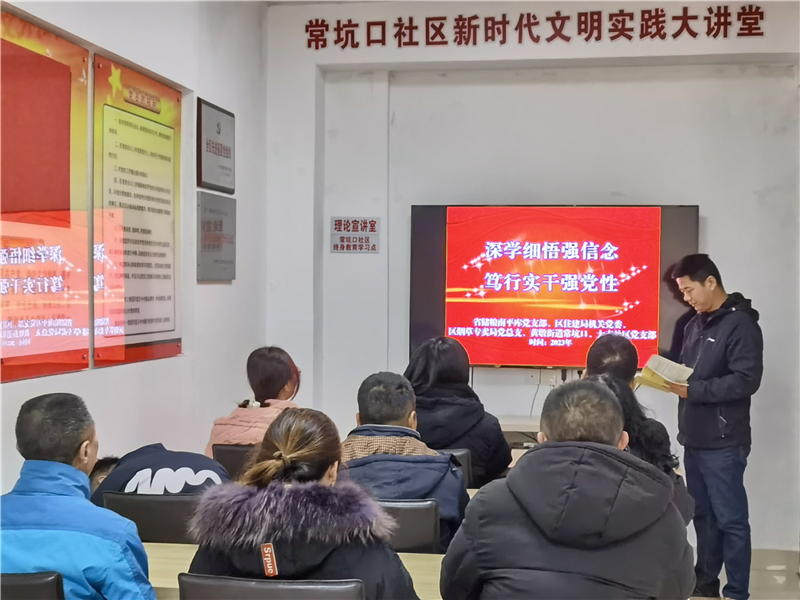 活动开始,常坑口社区挂点领导林剑武大队长带领大家一起学习《习近平新时代中国特色社会主义思想学习纲要(2023版)》,深刻理解这一思想的核心要义、精神实质、丰富内涵、实践要求,自觉用这一思想武装头脑,做到系统学习、全面把握、认真落实。