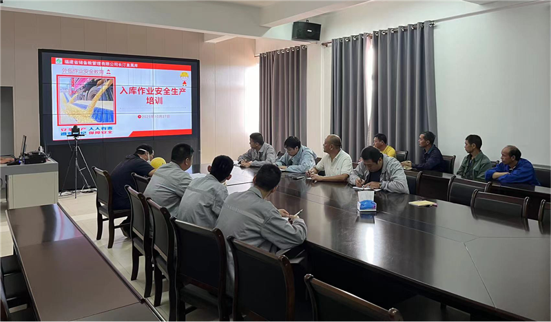 为进一步强化粮食入库外包作业安全管理,严格落实各方安全安全生产责任,有效防范各类事故发生,10月27日上午,长汀直属库召开粮食入库外包作业安全生产培训会议,库主任、分管安全工作的副主任、仓储科全体员工以及外包作业人员参加会议。