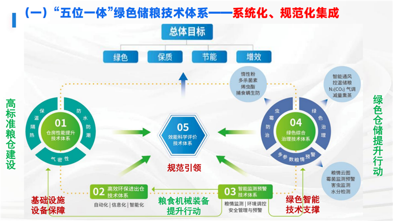 “五位一体”绿色储粮技术体系是国家粮食和物资储备局为深入贯彻习近平总书记关于保障国家粮食安全的重要指示批示精神,聚焦“十五五”绿色、智能发展方向,提出的以仓房性能提升、高效环保进出仓、智能监测预警、绿色综合治理、效能科学评价为核心的绿色储粮技术体系,旨在解决我国不同储粮生态区绿色储粮新技术应用规范性弱、集成度不高、系统性不强等问题。