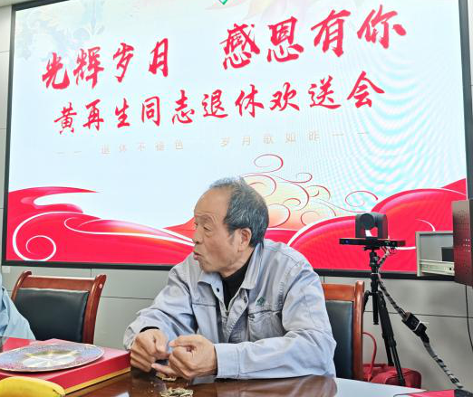 黄再生同志1981年参军入伍,退役后分配到粮食系统,始终扎根储备粮一线,粮食保管经验丰富、业务能力扎实,在平凡的岗位上以坚守诠释着责任与担当。欢送会上,工会主席对黄再生同志数十年如一日为公司发展作出的贡献给予高度评价。随后,同事们纷纷发言,回顾了与黄再生同志共事的点点滴滴,分享了工作中难忘的瞬间,言语间,充满了不舍与感恩之情。