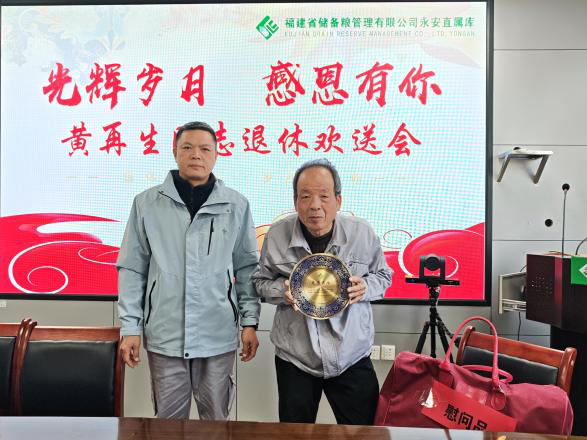 最后,直属库负责人向黄再生同志颁发了退休纪念品,并送上了诚挚的祝福,祝愿他退休生活幸福美满、健康长寿、万事如意,同时希望他继续发挥自身经验优势,积极建言献策,为省储备粮高质量发展贡献更多银发智慧。