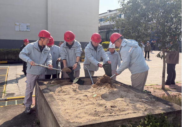 培训结束后,全员迅速转场至宁德直属库P33号仓开展现场防汛演练。演练模拟因强台风带来持续暴雨,库区面临雨水倒灌风险的紧急情况。演练总指挥一声令下,各应急小组迅速响应,分工协作,紧密配合。大家手持铁锹,争分夺秒地装填沙袋,并按照预定方案,将一袋袋装好的沙袋有序、整齐地堆砌在仓库大门关键部位,构建起一道坚实的防水屏障,有效阻断了“雨水”向仓内漫延的路径,成功保住了仓内“粮食”安全。