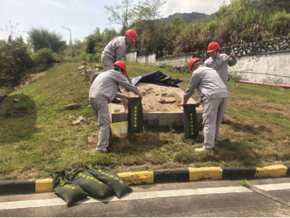 本次演练严格按照“实战化、专业化”要求,模拟强降雨引发库区内涝、仓房周边积水倒灌的紧急场景。值班巡库人员发现险情后立即上报,指挥组迅速启动防汛应急预案,实时上报汛情,统筹协调各项抢险工作;救援组争分夺秒装填沙袋,有序堆砌封堵仓门,阻断雨水蔓延;后勤保障组做好现场安全警戒和物资调度工作。