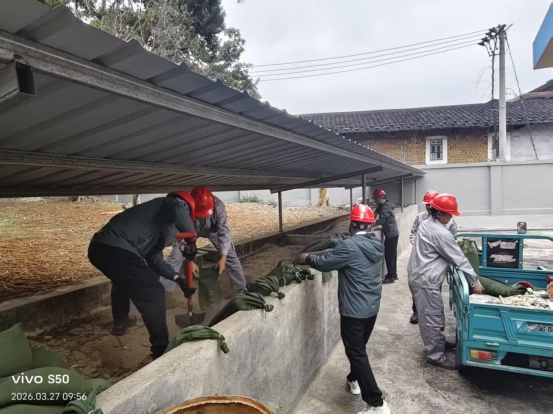 防汛演练模拟了突降暴雨,导致山洪暴发,洪水从库区后门倒灌库区,库区排水沟无法完全排除洪水,P13#仓后门的积水深达20厘米,危及P13#仓储粮安全。演练总指挥接到报警后,启动防汛应急响应,演练人员,迅速集中到P13#仓,有序开展应急抢险,对P13#后门进行封堵,确保洪水不会倒灌仓内,有效保障储粮安全。通过本次防汛实战演练,全面检验了应急预案在预警发布、物资调度、险情处置及多方协同配合等关键环节的运行情况。