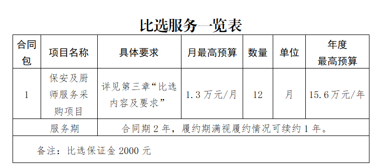 福建省中会通招标代理有限公司受福建省储备粮管理有限公司福安直属库的委托,对福安直属库保安及厨师服务采购项目进行公开比选采购,现邀请国内合格的比选供应商前来参与比选。
